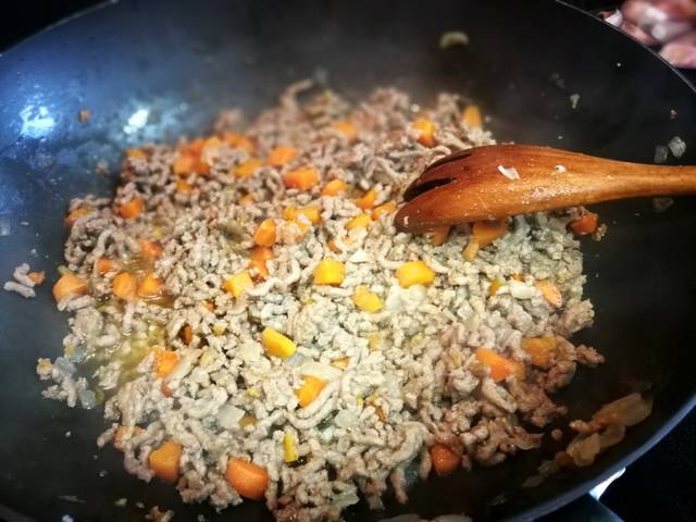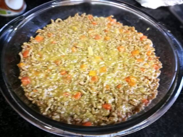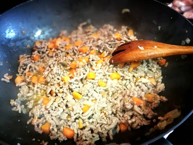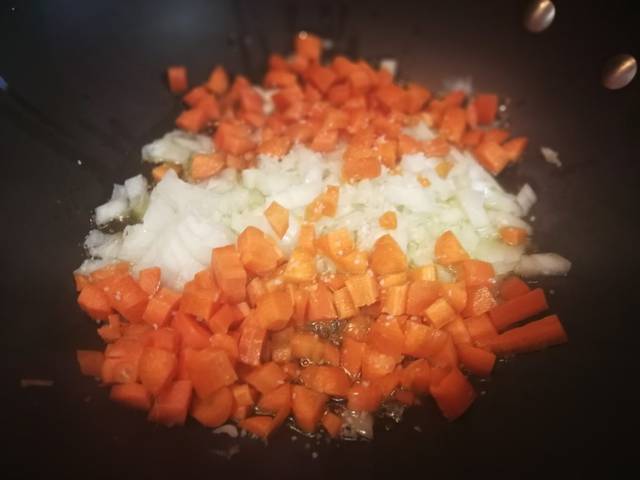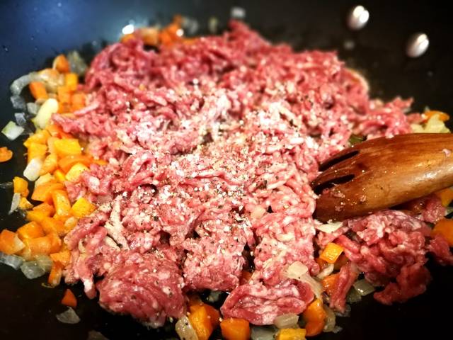 Echa 3 cucharadas aceite de oliva virgen extra en una sartén y deja calentar. Agrega la verdura picada y espolvorea una pizca de sal gruesa de roca. Mezcla de vez en cuando hasta que la verdura esta ponchada. A continuación añade la carne picada de ternera y mole granos pimienta negra. Mezcla bien los ingredientes hasta que la carne cambia de color.