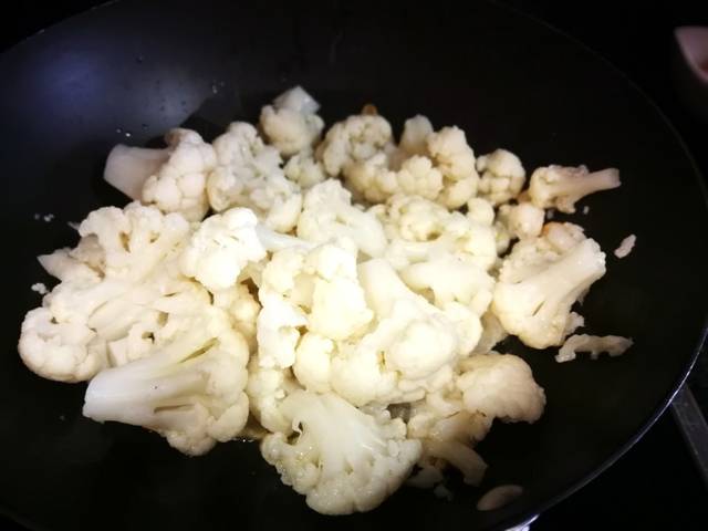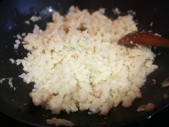 Dora ligeramente el ajo en 2 cucharadas aceite de oliva virgen extra. Agrega la coliflor bien escurrido y mezcla machacando los ramilletes de coliflor. Después de 10 minutos aparta del fuego.