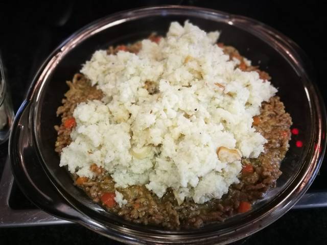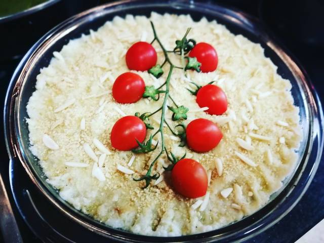 Echa la carne ponchada con la verdura en el molde. Con una espátula extiende la carne por toda la superficie. Coloca encima el puré de coliflor y extiende por toda la superficie. Coloca en medio el ramillete de tomatitos cherrys y esparcir las almendras en bastoncillos. Mete el molde en el horno para 30 minutos.